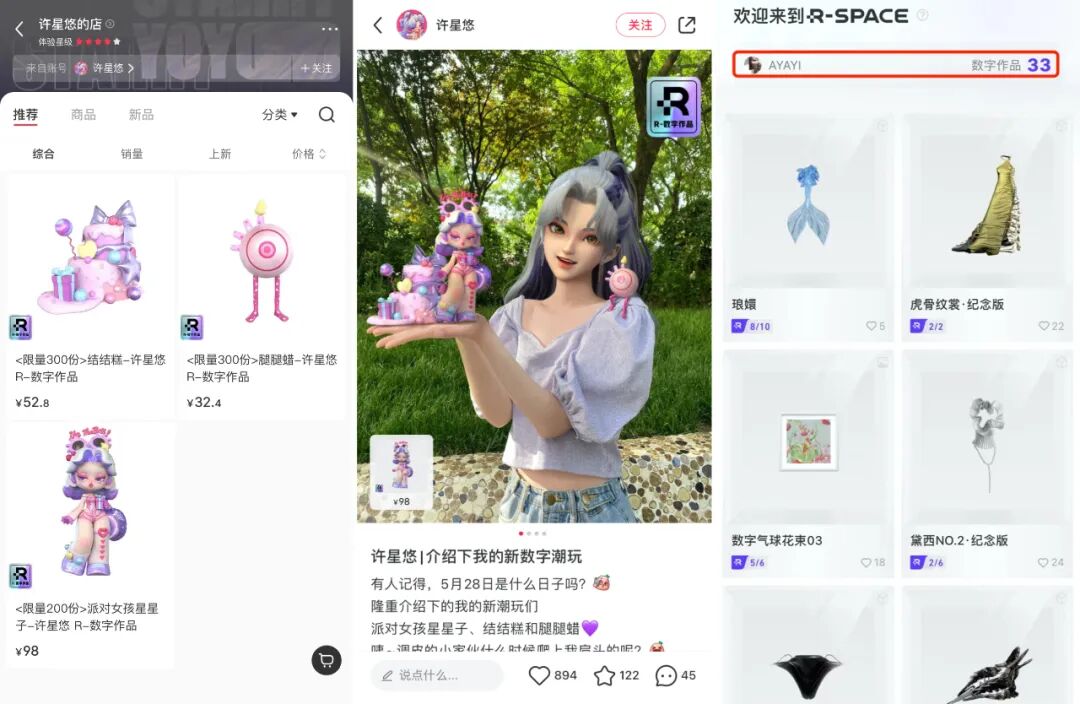 值得一提的是,小红书上的部分虚拟人也在发布数字藏品,如动画《左手上篮》及其衍生作品中的角色许星悠,其曾代言过康师傅系列饮料,还曾登上杂志《WonderLand》,目前其通过小红书发布了三款数字潮玩,分别售价32.4元/52.8元/98元,分别发行300份/300份/200份;曾经靠一张图片出道,一夜之间吸粉数万,并受到众多知名品牌青睐的AYAYI,也和数字藏品进行贴近,除了担任相关活动主理人,其购入的数字藏品数量也已达33件,包含虚拟时装、饰品、版画等多样类别,这样的做法既符合其风格调性,看起来也更有作为“人”的实感。