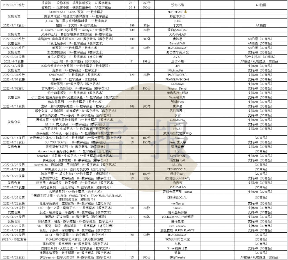 总体来看,天猫的数字藏品目前更多是和一些头部品牌进行合作,格调相对较高,这一定程度也体现在数字藏品的品质上,发行数量上,以千份居多,数字藏品也和平台的购物节等活动进行贴合。