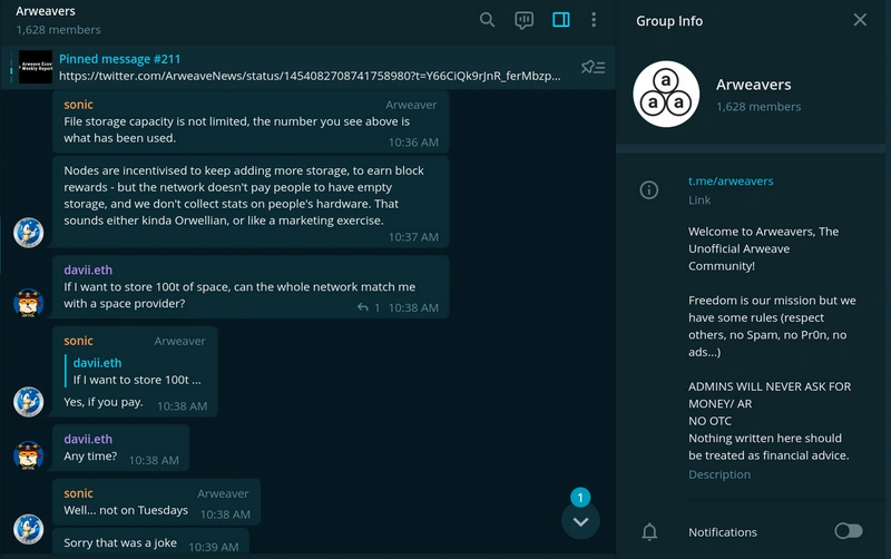 另一个用于社区参与的工具是 Telegram,你可以加入 Arweaver Telegram 社区。这是一个技术性不强的聊天工具,在那里大家更多的是关注于价格和协议的一般效用。甚至在今年,该社区还在里斯本举行了一次聚会。