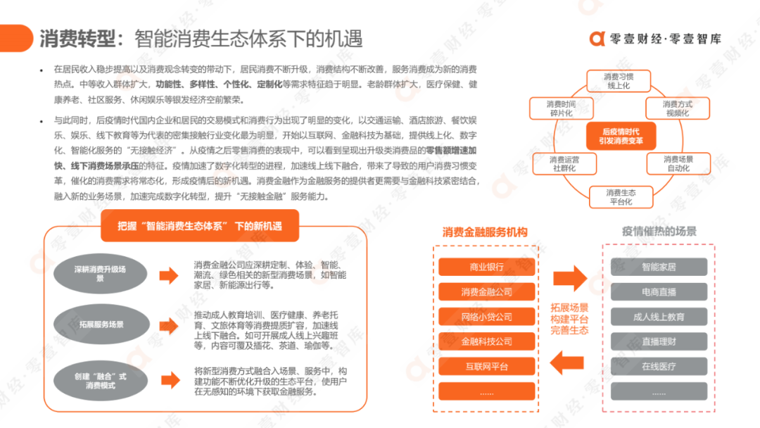 结合我国消费金融环境,零壹智库基于多家金融机构的调研成果,提出消费金融十大趋势与六大挑战,从垂直细分场景、产品创新化、用户差异化、错位竞争、数字竞争力与长远战略等方面,多措并举才能走出由“高增速”发展向“高质量”发展的消费金融之路。