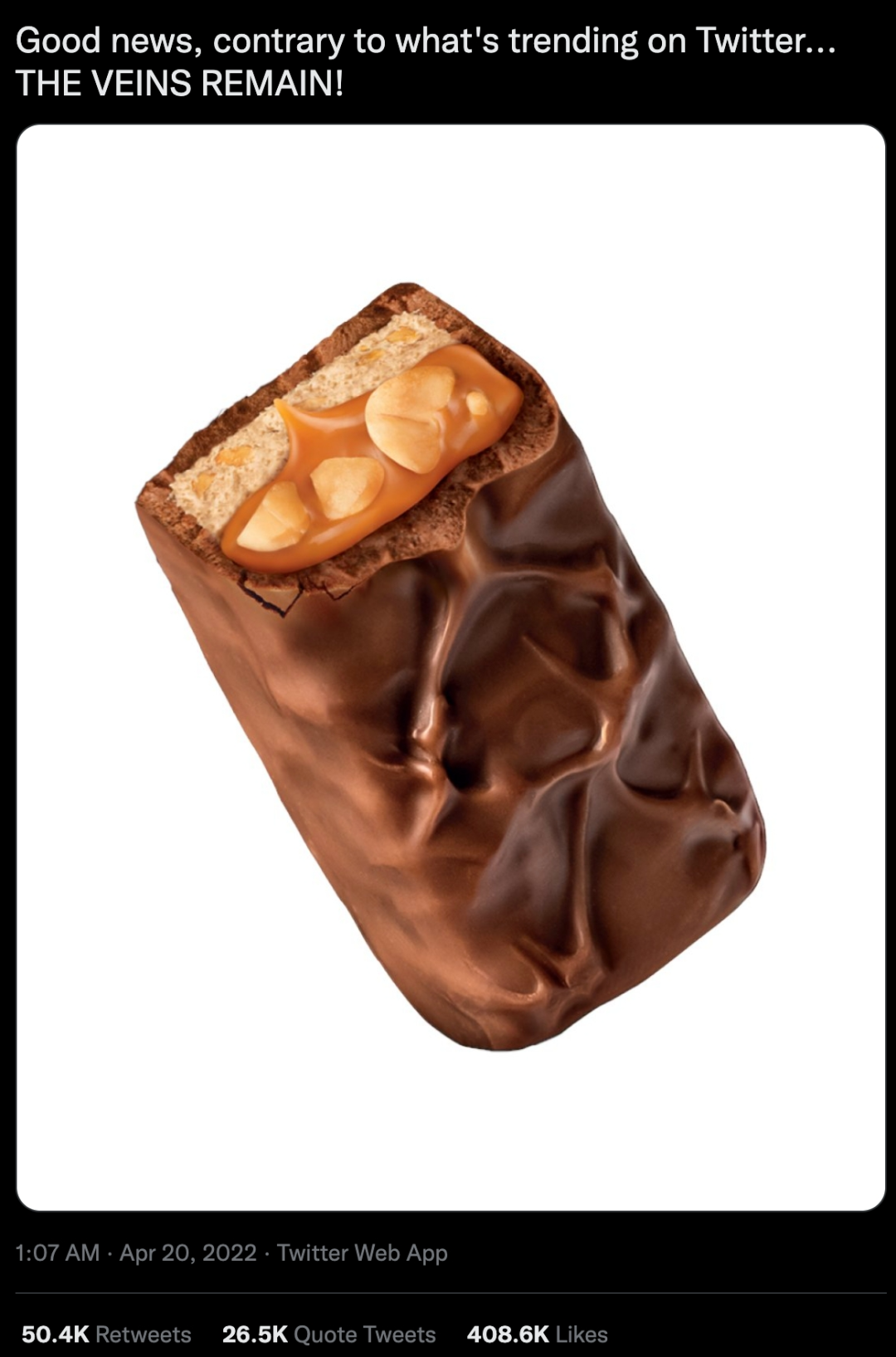 甚至还有网站上的新闻表示,玛氏公司发表声明称:“……一些消费者告诉我们,我们的士力架糖果棒上的纹理涂层容易引起不好的联想……为此,我们决定用一个更光滑的巧克力涂层代替如今的。”