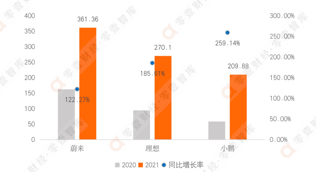 图4 蔚来、理想、小鹏2021年营业收入及增长率对比(单位:亿元)