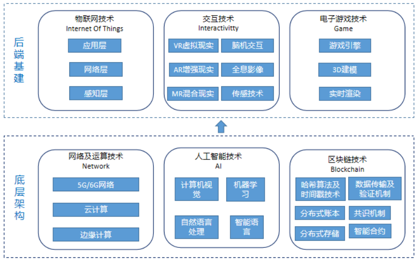 元宇宙是基于互联网应用场景的一次全面的、革命性的升级,它基于交互技术、人工智能、云计算、区块链等技术来构建,其本身并不是一种技术,而是一种社会形态,虚实相融,最终形成物质世界与精神世界的闭环生态。