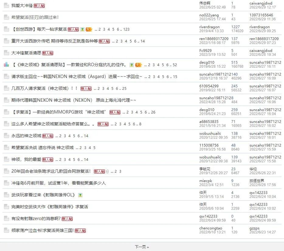 复活老网游已形成了一股风潮,另一家公司创天互娱的“新游推荐”版面也充斥着玩家请愿老游戏再度开服的帖子