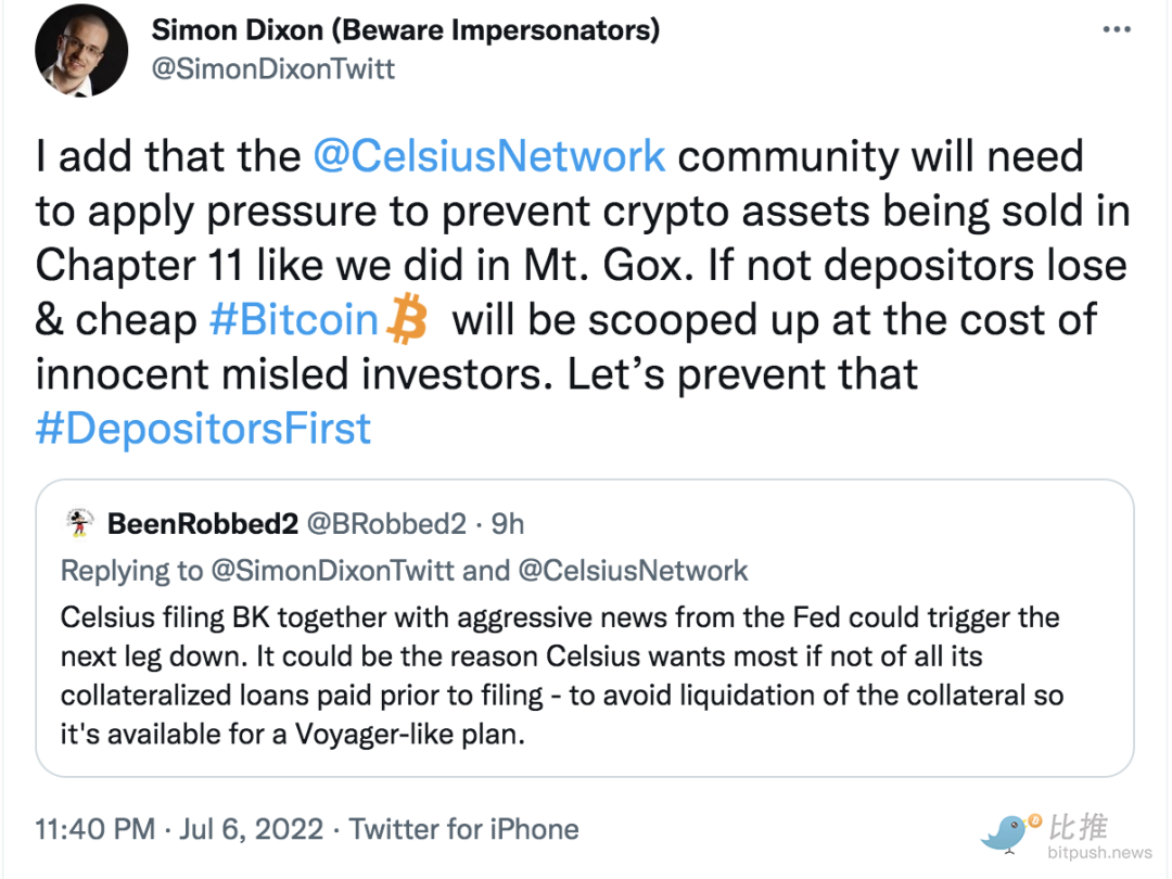 BnkToTheFuture首席执行官Simon Dixon在推文中警告说:“我补充一点,Celsius Network社区需要施加压力,以防止存在 Celsius 的资产根据破产法第 11 章被出售,就像 Mt. Gox 事件中发生的那样。如果不是储户损失,廉价的比特币将以无辜的被误导投资者为代价被抢购一空。让我们阻止这一切,#DepositorsFirst(储户第一)”。