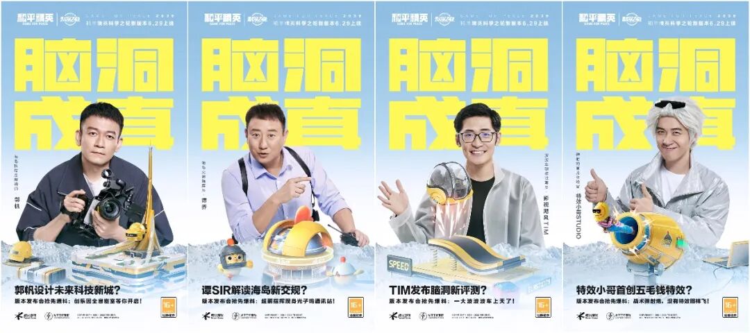 例如,《和平精英》邀请了科幻电影导演郭帆,担任海岛科技的“总架构师”;还请来了科技测评博主@影视飓风Tim、《谭谈交通》主持人谭乔等,还有四位来自PEL的电竞职业选手带领玩家们一同探索“创乐园”。