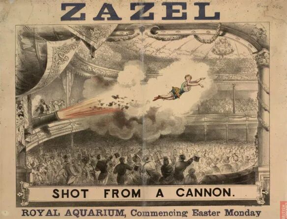 1877年4月2日,在英国伦敦的皇家水族馆,一位艺名“扎泽尔”(Zazel)的17岁女孩,进行了有史记载的第一次“人间大炮”表演。当时的一份英国报纸,大致记录了表演的过程:
