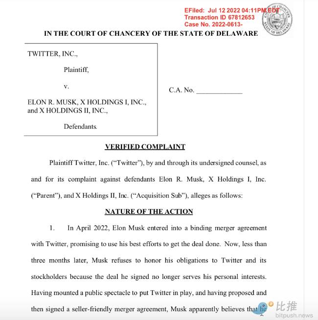 根据当地时间周二晚间公开的法庭文件,推特(Twitter)已在美国特拉华州 Chancery 法院对埃隆・马斯克(Elon Musk)正式提起诉讼,此前这位亿万富翁表示他将单方面终止这项价值 440 亿美元的收购协议。
