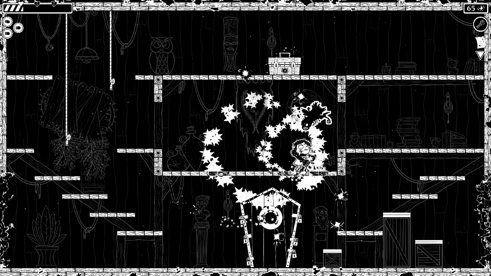 因为有平台跳跃的元素在,剩下的小装置装备则是围绕着主角的移动来设计的,功能各异的各种鞋子可以提供二段跳、空中悬停、缓慢降落等功能。