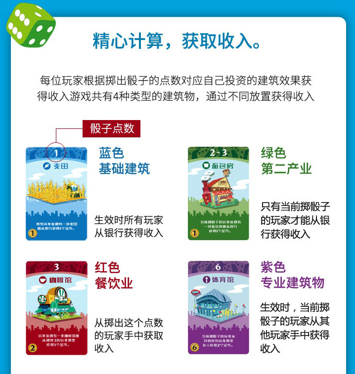 每位玩家初始拥有一些建筑卡片作为起始牌,以及三枚金币作为初始资金。每回合要依次掷骰子,根据点数发动对应的卡牌效果(类似炉石的卡牌费用概念,摇出几点就可以发动几费的卡牌),这也是游戏的核心玩法。而相应的卡牌效果将为玩家带来不同的增益或惩罚,比如一张麦田卡,在任意玩家投出1时,都能让拥有麦田的玩家获得一枚金币。