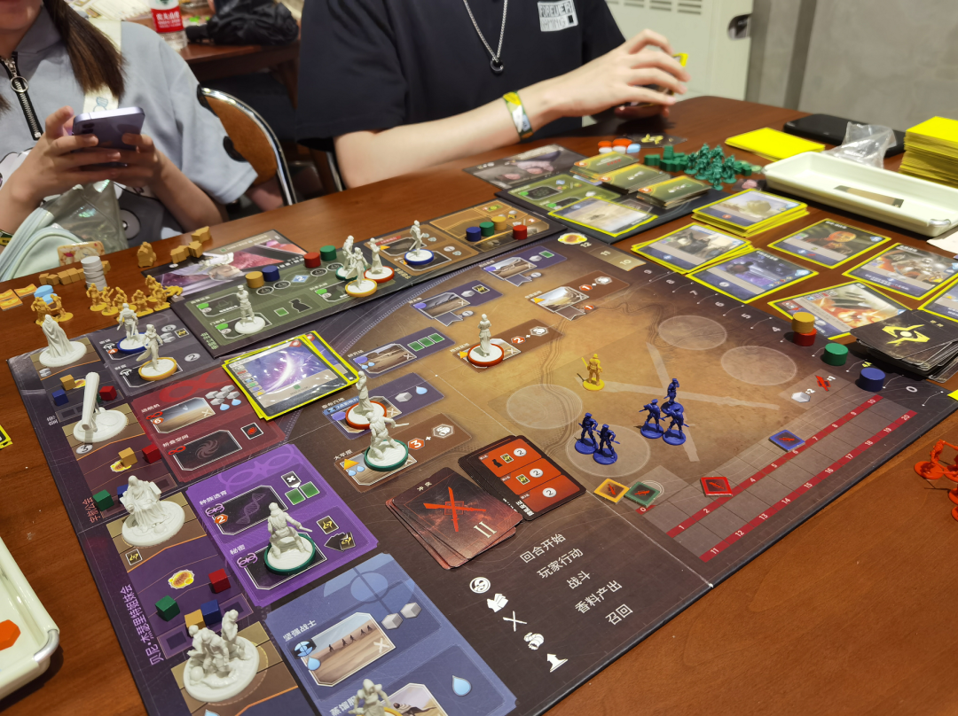 不过就我个人而言的话,我还是更喜欢重策略一些的游戏(嘿嘿,一个老德棍露出了笑容),所以在官方组织的party时间后,我又与3位同好继续去桌游店,一起开了一把《沙丘:帝国》。沙丘可以算是一个“美皮德心”的中重策游戏,故事背景与艺术形象取材于同名电影,核心机制是卡组构筑(DBG)和工人放置。我们大概晚上八点半开始的游戏,由于我是第一次玩,所以一开始的set与推新浪费了二三十分钟。最后经过了大概两个小时的酣畅淋漓的头脑碰撞后(实际人均猪脑过载),以一分之差惜败。但还是一个字:爽!推荐给稍微进阶的桌游爱好者~