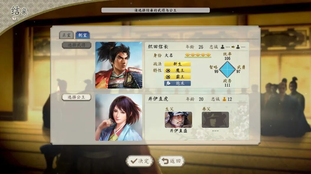 织田信长不能和亲妹妹喜结连理,但是可以把她的女儿纳为侧室。信长的儿子信忠和姑姑结婚,也不会受到游戏机制的惩罚和NPC的谴责。