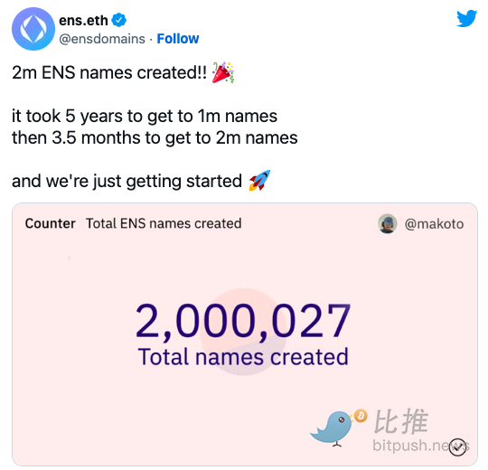 ENS域名账户在推特上写道,“创建了200万个ENS域名!花了5年时间达到100万个域名,然后花了3.5个月达到200万个,而我们才刚刚开始。”