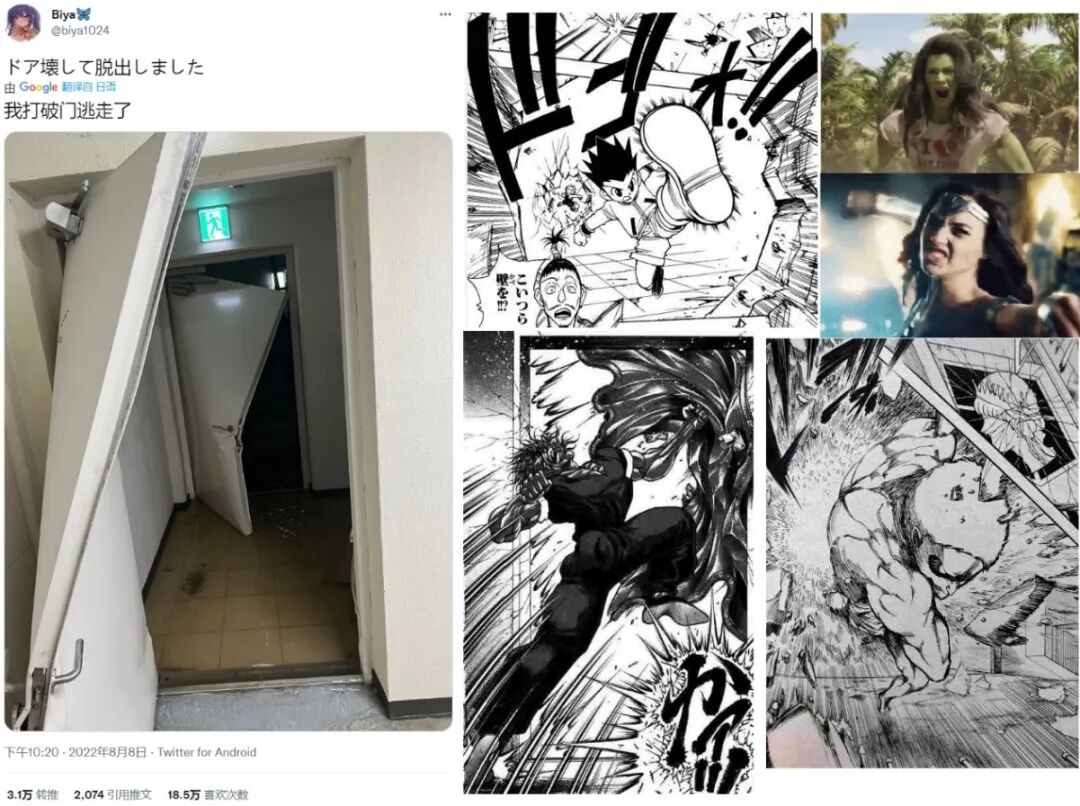 右边是充斥这条推文评论区的梗图,至于门究竟是怎样被砸成这样的,倒也没多少人真的关心
