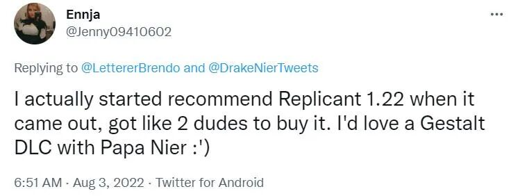 但Ennja没理会任何非议,也完全看不出想利用刚聚集起的影响力做些什么。随着事件逐渐冷却,如今的Ennja不仅早就找到了人人都爱《尼尔》的社区,推特上的粉丝也稳步逼近一千大关。