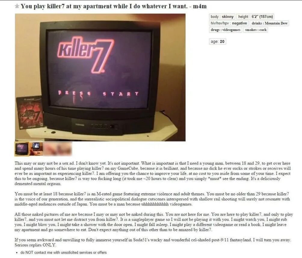 “我需要一名年轻男子,18到29岁之间,到我家花上几十个小时来玩NGC上的《杀手7》。因为它实在是太棒了,除了时间外无需任何其他花费,就能让你的生命获得升华。”