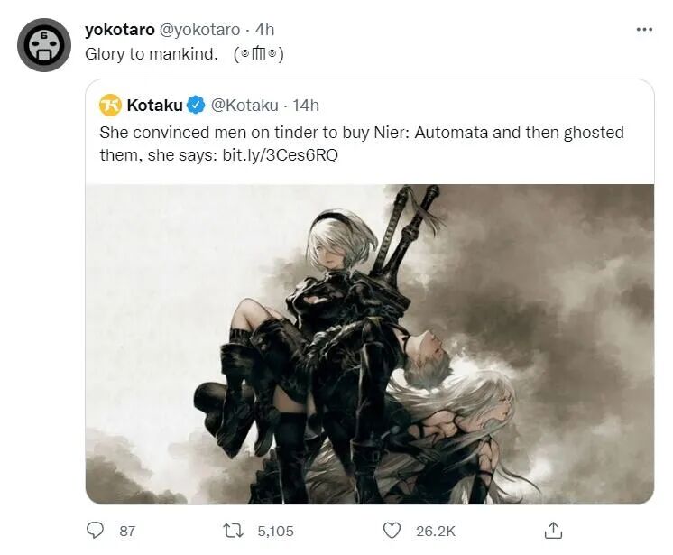 但在这件事被曝光后,她的账号粉丝已经成倍地增长到近千个,获得了极大关注。不管是不是《尼尔》系列的粉丝,都赶来围观这次难得一见的“色诱式游戏推荐”。就连游戏的制作者横尾太郎,也再次凑热闹般地转发了这条新闻,并附文“人类荣光永存”(Glory to mankind)。