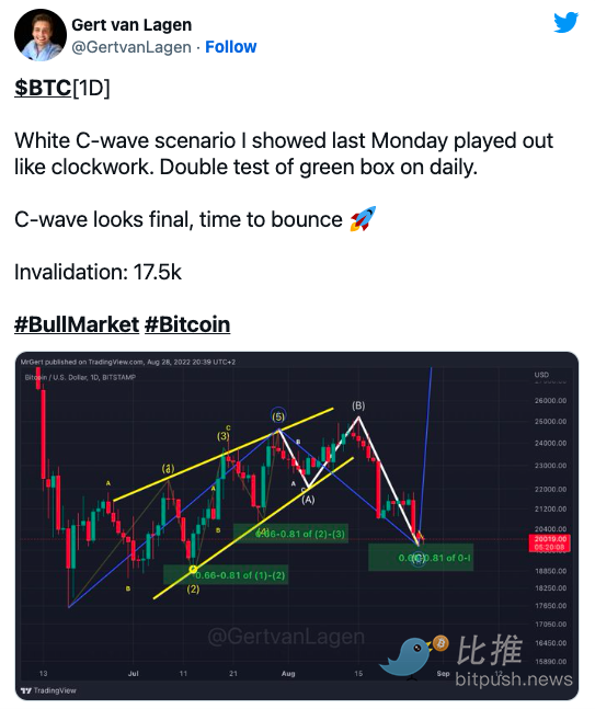 在 17,000 美元或更低的呼声中,技术分析师 Gert van Lagen 给出了日线图 17,500 美元的最低目标。