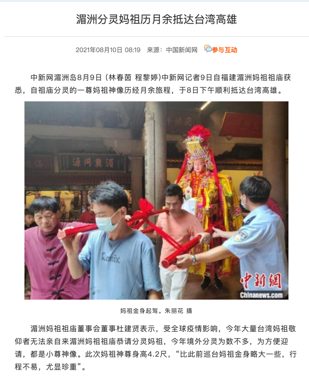 在同样广泛信奉妈祖的我国台湾,如今每年仍有为期九天八夜、来回路程达340公里的「大甲妈祖出巡绕境」活动。