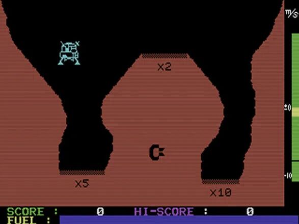 控制登月舱降落的电脑坏了,由玩家扮演的宇航员必须手动控制推进器的燃料消耗量,减缓飞船的下落速度,从而安全着陆。每隔10秒钟,屏幕上会显示一行报告,统计飞船的高度、降落速度,以及剩余的燃料总量。报告的结尾是一个问号,要求玩家输入0-200之间的一个数字,决定接下来10秒内的燃料消耗量。
