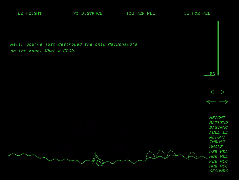 假如登月舱撞上了麦当劳,游戏就会呵斥玩家:“你刚刚摧毁了月球上的唯一一家麦当劳,你个笨比(Clod)。”
