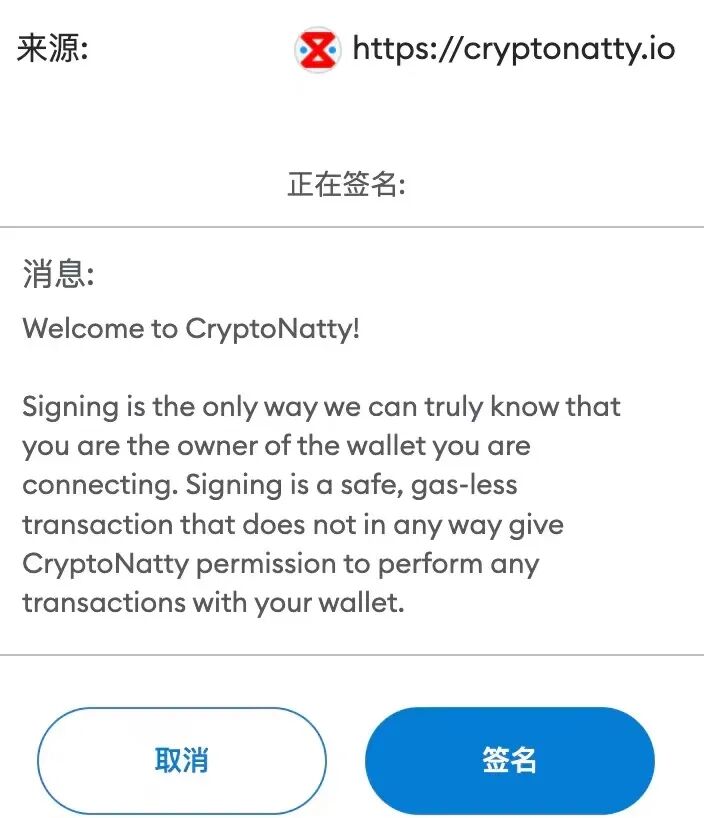 在站点向用户发起签名请求时,用户需要对站点和待签名数据的合法性进行认证,经确认无误后再执行签名操作,确保签名操作执行的链上行为符合用户预期。在遇到待签名消息为纯16进制不可读数据时,用户应坚持拒绝签名。