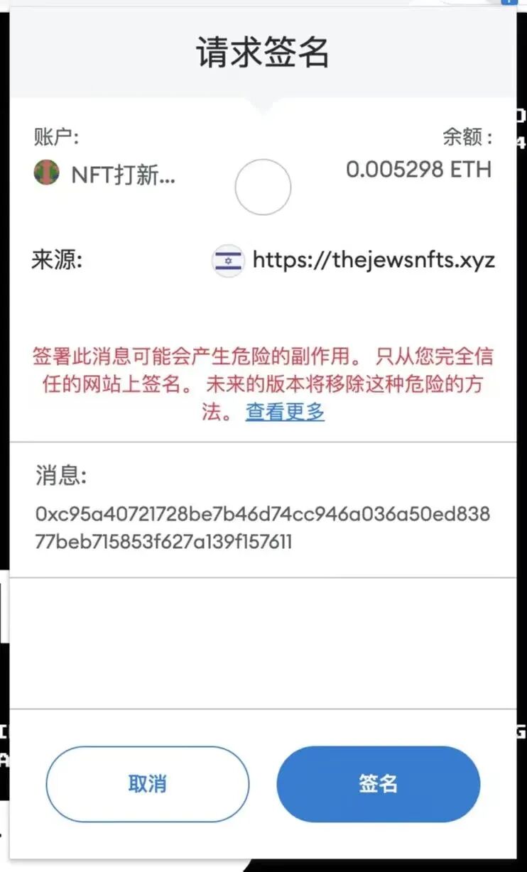 下图给出了一个不安全的待签名请求,发起该请求的站点为钓鱼站点 https://thejewsnfts.xyz,在后文我们还将对其通过仿冒推特账户实施攻击的方法进行阐述。