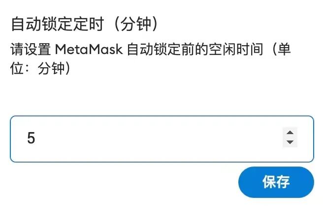 在使用区块链钱包软件时,用户应设置强解锁口令以避免遭受口令爆破攻击。在离开电脑前,应主动锁定屏幕和钱包,以避免遭遇因电脑钱包处于未锁定状态导致数字资产被滥用。Metamask钱包提供的自动锁定定时功能如下所示。
