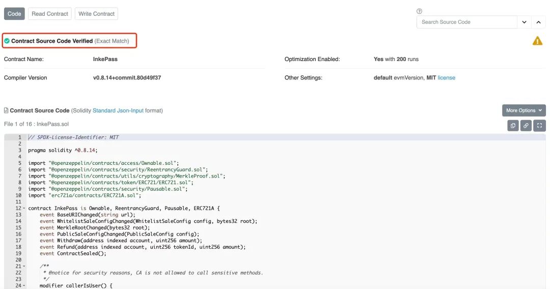 区块链浏览器还提供了智能合约开源展示的功能,便于用户在与智能合约交互前对代码安全性进行审查。用户应当掌握检查智能合约是否已处于开源验证状态的方法。用户应当优先选择与已完成智能合约代码开源验证的处理的智能合约进行交互。用户应通过区块链浏览器,对智能合约代码安全性进行审计,在确保代码不存在权限滥用或恶意使用用户数字资产的行为后,再与合约进行交互。已完成智能合约代码开源验证处理的智能合约在区块链浏览器中的展示信息如下所示: