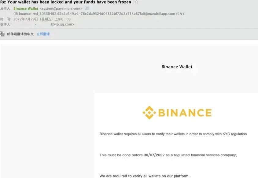 下图给出了一封以盗取区块链数字资产为目标的钓鱼邮件:用户需要在特定截止日期(DDL)前在平台处登记区块链钱包,不然就冻结(威胁)账户。在收到这类电子邮件时,不点击邮件或私信中包含的任何超链接信息或按钮,待与官方核实确认邮件内容合法性后,再对邮件进行处理。