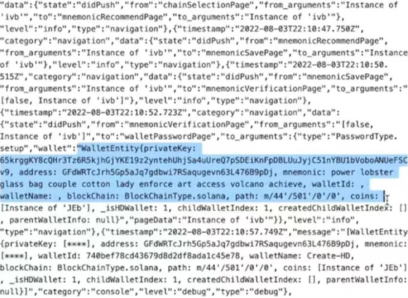 2022年8月4日,知名公链Solana发生大规模用户丢币事件,大量用户声称其持有的SOL及SPL标准代币被转移至特定的四个Solana钱包,随后Solana官方安全研究人员发现,盗币事件与支持Solana的区块链钱包Slope相关:Slope钱包违规使用了sentry监控服务,将用户的任何行为及操作数据都会被上传至Slope官方的服务器并被记录:在用户创建Solana钱包时,钱包对应的助记词及私钥都以明文形式上传至服务器。安全研究人员通过抓包检测到Slope钱包存在明文传输用户隐私信息行为如下: