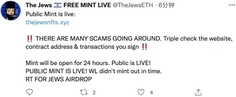 相似的推特用户名:为了以假乱真,攻击者还专门按照正版账户的推特用户名设置规则进行了仿冒,仿冒账户为@TheJewsETH,正版账户为@TheJewsNFT;