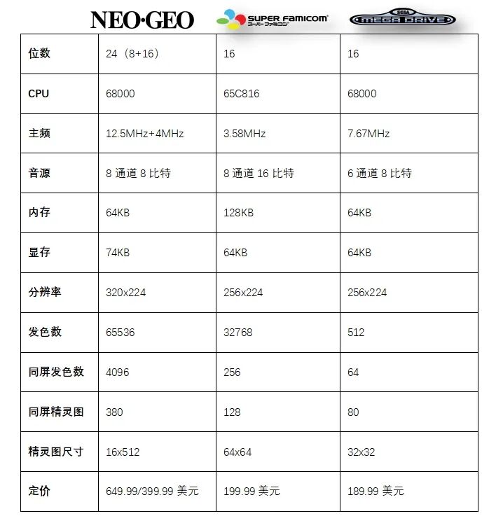 NEOGEO的AES系统与超级任天堂、世嘉MD主机的性能参数对比: