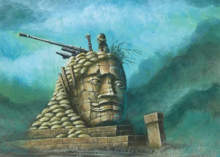 未被采用的《合金弹头》初期概念设计稿,参考了吴哥窟的石像。石像要素后来出现在游戏正式版第一关,以至于不少不太清楚参考原型所在地的玩家将游戏称为“越南战争”。图片来源:《合金弹头终极历史》