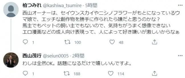 然而,西山茂行的这句话,被理解成了“星云天空涩图二创获得了马主的‘随意使用许可’”,许多网友为此欢欣雀跃,在推特上进一步地追问西山茂行“既然有了‘许可’,那么做些色情、猎奇的事情也完全没问题是吧?”