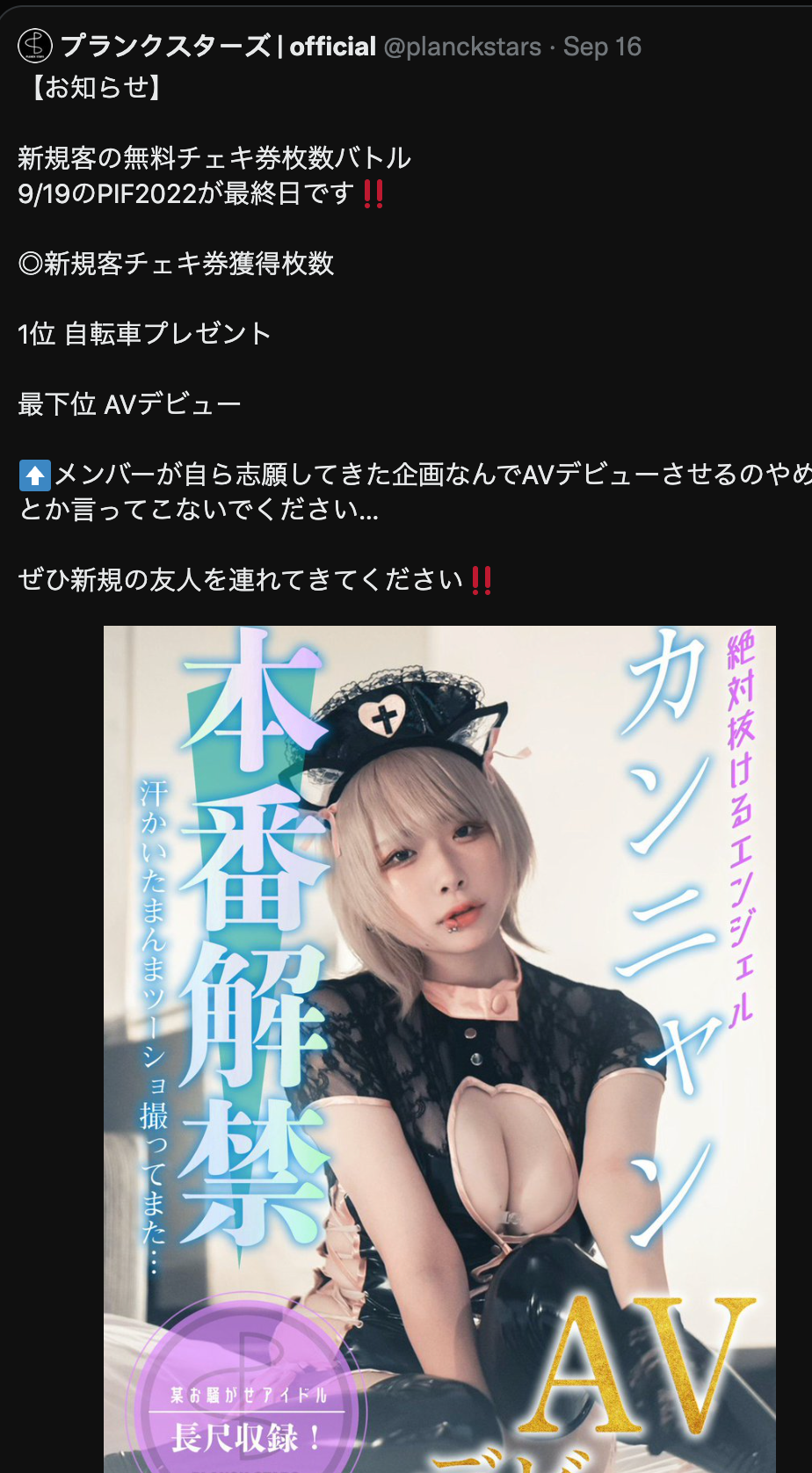 日本地下偶像团体「PLANCK STARS」的官方账号,于近日发布了一条推特,表示自己要展开一次人气排名活动。