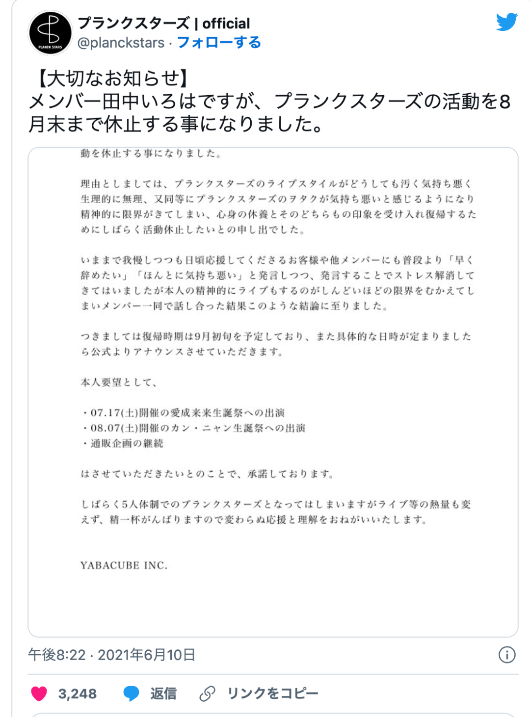 哪怕对成员来说也是如此。就在近年,「PLANCK STARS」的一位成员宣布正式退团,而她给出的原因,则是“这的演出方式太过于肮脏和恶心,生理上不能接受。同样我觉得宅男粉丝也很恶心,我的精神已经到了极限”。