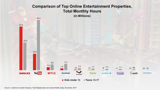 Roblox是如今最吸引年轻人的平台之一,与Roblox合作有助于推广耐克在年轻人之间的影响力以及品牌塑造。据comScore(一家媒体公司)的 统计,13 岁以下儿童每个月用在 Roblox 桌面端的时间超过 50 个小时。