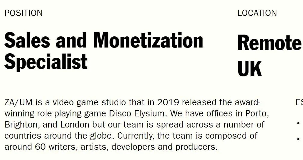 在最近的那次招聘里,还有玩家发现其中的一个职位是“销售和货币化专员”,这是一个常出现在抽卡类手游或服务型游戏开发组里的职位,听起来似乎和《极乐迪斯科》完全无关。于是玩家们不免将它和NFT等事物联系到了一起,担忧起ZA/UM工作室会不会也一脚踏偏走上歪路。