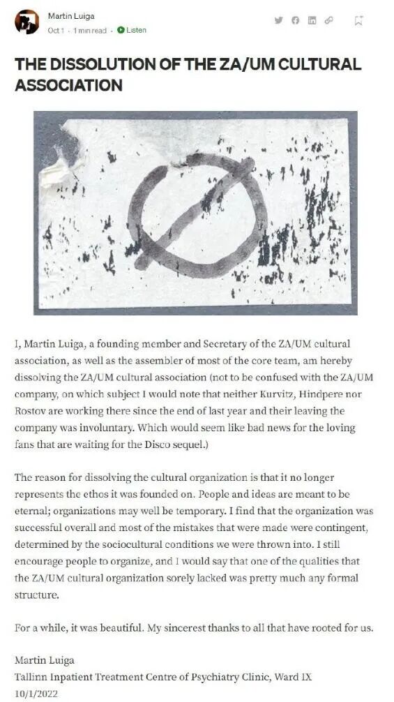 10月1日,《极乐迪斯科》的前编剧Martin Luiga突然发文宣布ZA/UM解散。