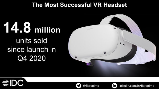 Meta Quest是Meta旗下的VR头显设备品牌。这个以亲民售价打通消费者市场的一体机品牌商业成绩喜人,根据数据分析公司IDC的报告,自2020年10月发售以来,Meta Quest 2的销量已达1480万台,作为对比,PS5发售一年半的销量在2100万台左右。不难看出,曾经那个销量寡淡的VR设备行业,如今已有追赶传统游戏主机市场的趋势。