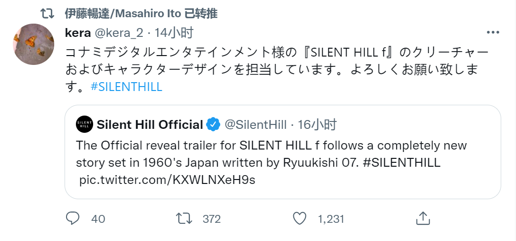 与此同时,以伊藤畅达和山冈晃为代表的Team Silent老成员对于新作也表现得相当捧场,积极转发相关内容。尤其是曾经设计了“三角头”形象的伊藤畅达还特地转发了新任美术设计师的自我介绍,多少传达了一些身为前辈对于继任者的认可。