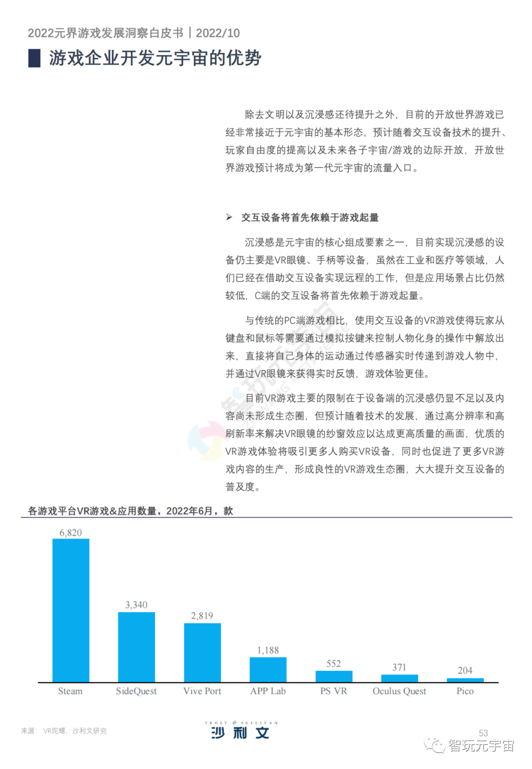 强大的游戏引票不仅能够实时宣染虚拟场景、树建拟真环境,形态已经基本成熟的开放世界游戏更是最接近理想的元字窗架构,而VR跟镜等交互设备也将首先依赖于游戏起量,并在不断的游戏迭代中升级沉浸式体验,因此我们认为游戏公司在元字窗初期能够率先占领流量入口,具备强力的先发优势。