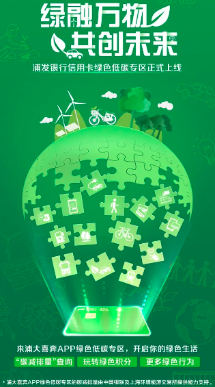 第三,信用卡板块上线“绿色低碳专区”。2022年7月下旬,浦发银行信用卡正式在“浦大喜奔App”上线“绿色低碳专区”,开放个人碳减排量查询服务、新增信用卡绿色积分,倡导践行绿色低碳生活方式。事实上,此前在2021年8月,浦发银行推出“碳账户”体系之后,就已经在业界首发“浦发银行绿色低碳主题信用卡”。